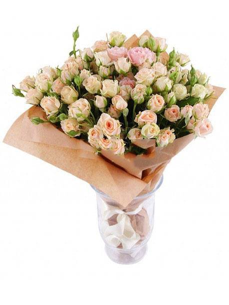 Букет «Крем-брюле» состоит из нескольких кустарных роз светлой цветовой гаммы. Спектр цветов берет начало в белом и заканчивается на розовом цвете, включая в себя множество растений с разными оттенками. Белые розы всегда были наиболее популярным символом чистоты, непорочности и отсутствия корысти. Букет прекрасно подходит для извинений перед друзьями или любимыми.